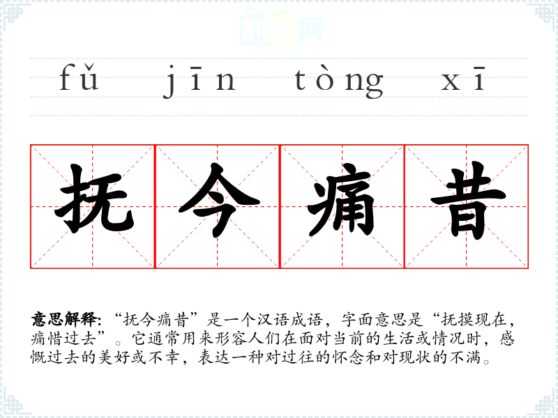 “抚今痛昔”是一个汉语成语,字面意思是“抚摸现在,痛惜过去”。它通常用来形容人们在面对当前的生活或情况时,感慨过去的美好或不幸,表达一种对过往的怀念和对现状的不满。