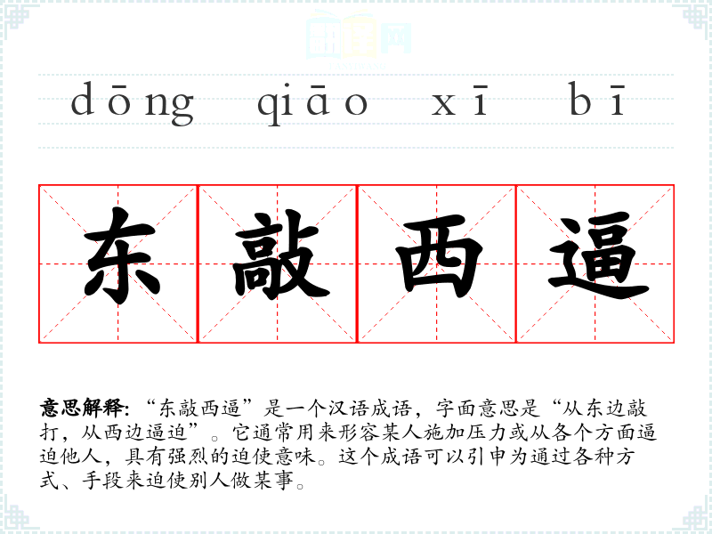 “东敲西逼”是一个汉语成语,字面意思是“从东边敲打,从西边逼迫”。它通常用来形容某人施加压力或从各个方面逼迫他人,具有强烈的迫使意味。这个成语可以引申为通过各种方式、手段来迫使别人做某事。