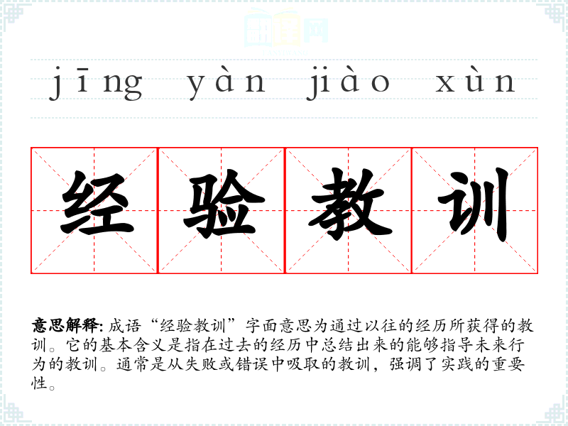 成语“经验教训”字面意思为通过以往的经历所获得的教训。它的基本含义是指在过去的经历中总结出来的能够指导未来行为的教训。通常是从失败或错误中吸取的教训,强调了实践的重要性。