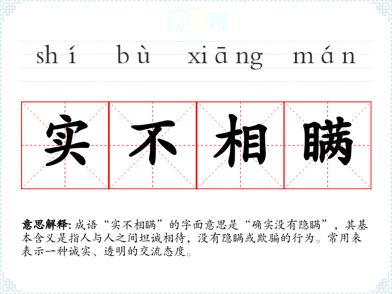 成语“实不相瞒”的字面意思是“确实没有隐瞒”,其基本含义是指人与人之间坦诚相待,没有隐瞒或欺骗的行为。常用来表示一种诚实、透明的交流态度。