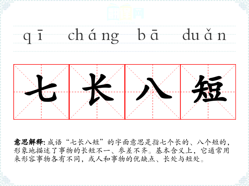 成语“七长八短”的字面意思是指七个长的、八个短的,形象地描述了事物的长短不一、参差不齐。基本含义上,它通常用来形容事物各有不同,或人和事物的优缺点、长处与短处。