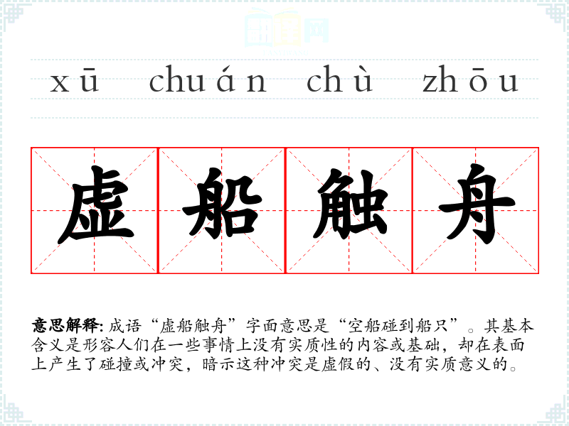 成语“虚船触舟”字面意思是“空船碰到船只”。其基本含义是形容人们在一些事情上没有实质性的内容或基础,却在表面上产生了碰撞或冲突,暗示这种冲突是虚假的、没有实质意义的。