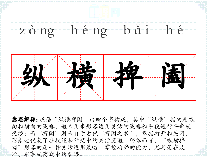 成语“纵横捭阖”由四个字构成,其中“纵横”指的是纵向和横向的策略,通常用来形容运用灵活的策略和手段进行斗争或交涉;而“捭阖”则来自于古代“捭阖之术”,意指打开和关闭,形象地代表了在权谋和外交中的灵活变通。整体而言,“纵横捭阖”形容的是一种灵活运用策略、掌控局势的能力,尤其是在政治、军事或商战中的智谋。