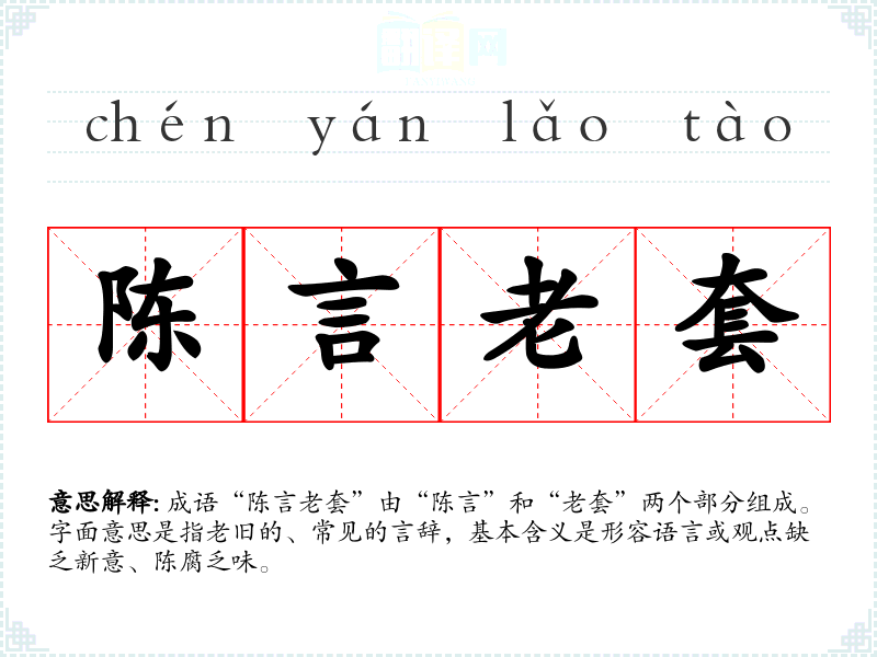 成语“陈言老套”由“陈言”和“老套”两个部分组成。字面意思是指老旧的、常见的言辞,基本含义是形容语言或观点缺乏新意、陈腐乏味。