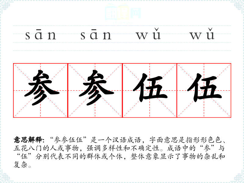 “参参伍伍”是一个汉语成语,字面意思是指形形色色、五花八门的人或事物,强调多样性和不确定性。成语中的“参”与“伍”分别代表不同的群体或个体,整体意象显示了事物的杂乱和复杂。