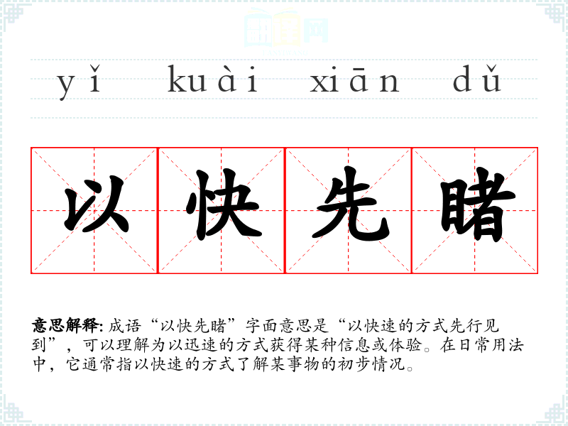 成语“以快先睹”字面意思是“以快速的方式先行见到”,可以理解为以迅速的方式获得某种信息或体验。在日常用法中,它通常指以快速的方式了解某事物的初步情况。