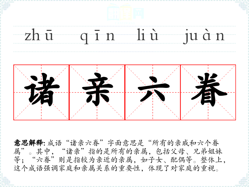成语“诸亲六眷”字面意思是“所有的亲戚和六个眷属”。其中,“诸亲”指的是所有的亲属,包括父母、兄弟姐妹等;“六眷”则是指较为亲近的亲属,如子女、配偶等。整体上,这个成语强调家庭和亲属关系的重要性,体现了对家庭的重视。