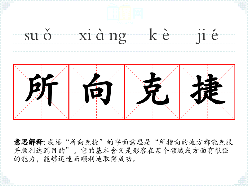 成语“所向克捷”的字面意思是“所指向的地方都能克服并顺利达到目的”。它的基本含义是形容在某个领域或方面有很强的能力,能够迅速而顺利地取得成功。