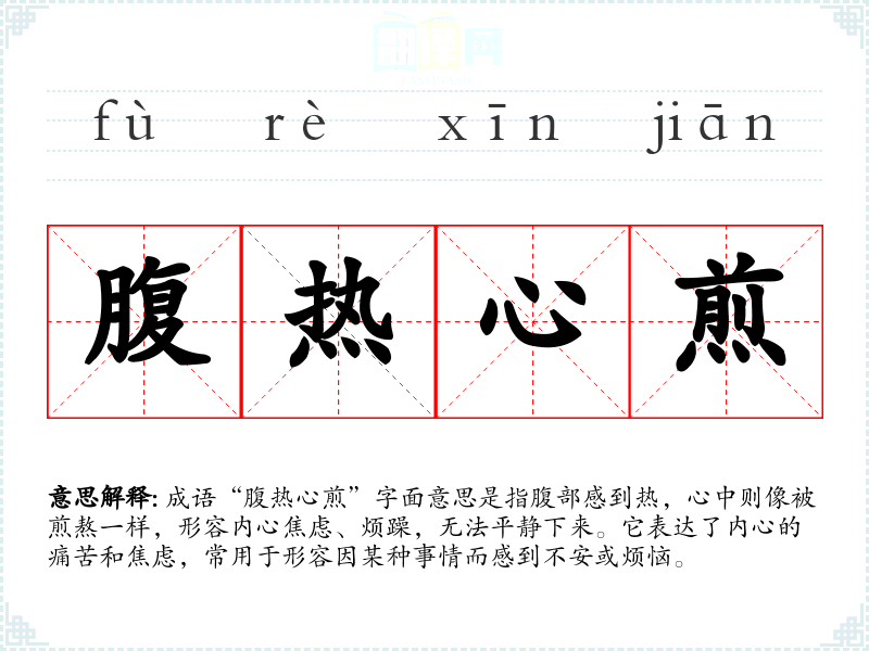 - 反义成语:心安理得、安然无恙。它们表达了内心的平静和安宁,与“腹热心煎”形成鲜明对比。