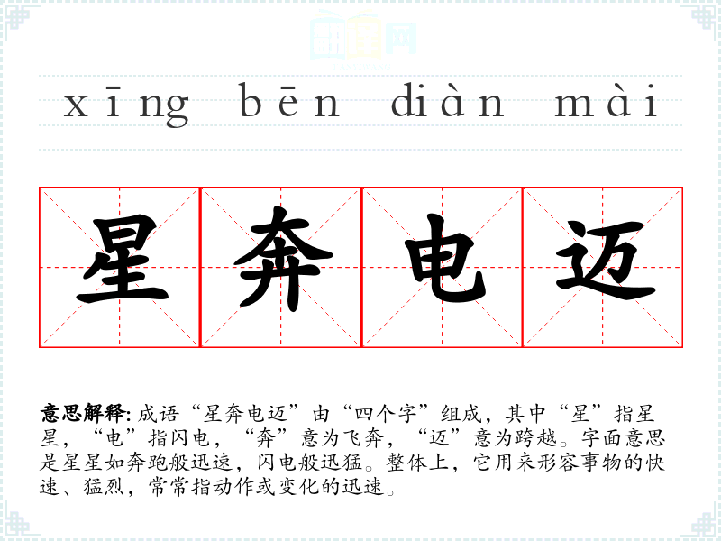- 日常对话:用来形容事情进展迅速,比如“这次项目的实施真是星奔电迈,大家都来不及反应。”