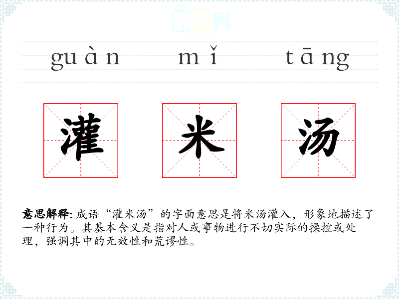 成语“灌米汤”的字面意思是将米汤灌入,形象地描述了一种行为。其基本含义是指对人或事物进行不切实际的操控或处理,强调其中的无效性和荒谬性。