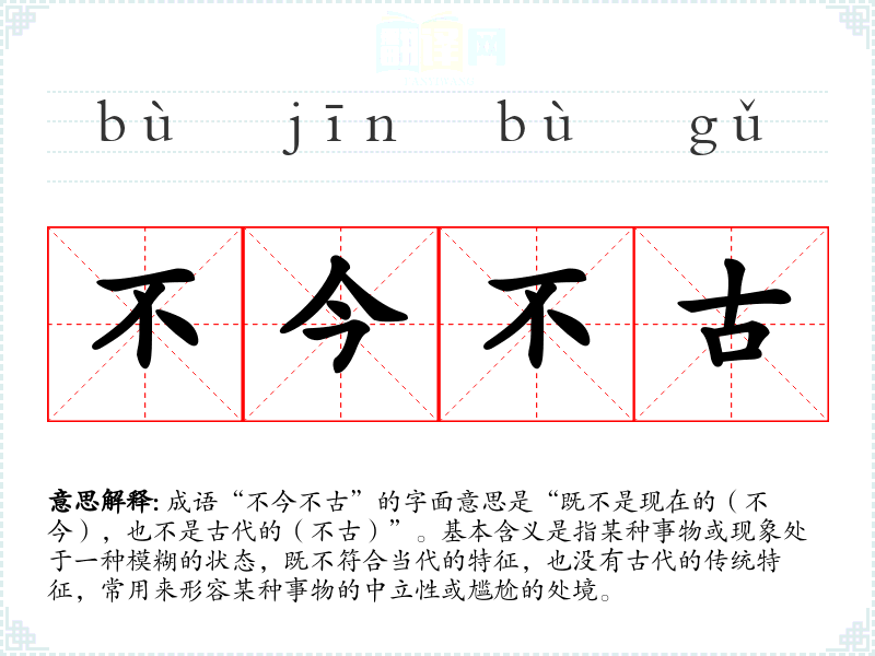 成语“不今不古”的字面意思是“既不是现在的(不今),也不是古代的(不古)”。基本含义是指某种事物或现象处于一种模糊的状态,既不符合当代的特征,也没有古代的传统特征,常用来形容某种事物的中立性或尴尬的处境。