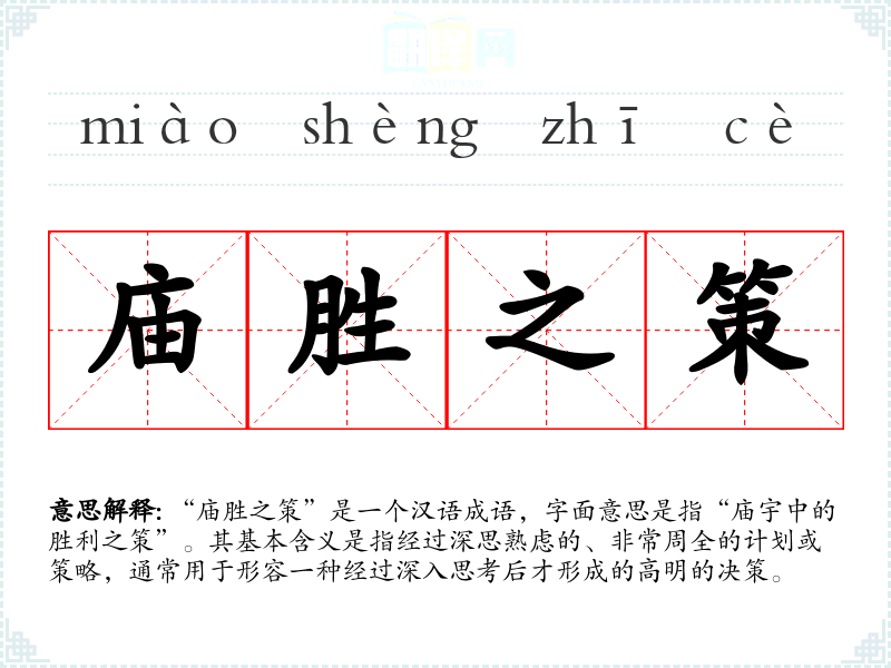 在英语中,没有直接与“庙胜之策”对应的成语,但“well-thought-out plan”或“strategy”可以表达类似的意思。这表明在不同文化中,都重视深思熟虑的决策过程。