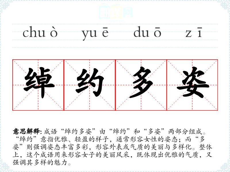 成语“绰约多姿”由“绰约”和“多姿”两部分组成。“绰约”意指优雅、轻盈的样子,通常形容女性的姿态;而“多姿”则强调姿态丰富多彩,形容外表或气质的美丽与多样化。整体上,这个成语用来形容女子的美丽风采,既体现出优雅的气质,又强调其多样的魅力。
