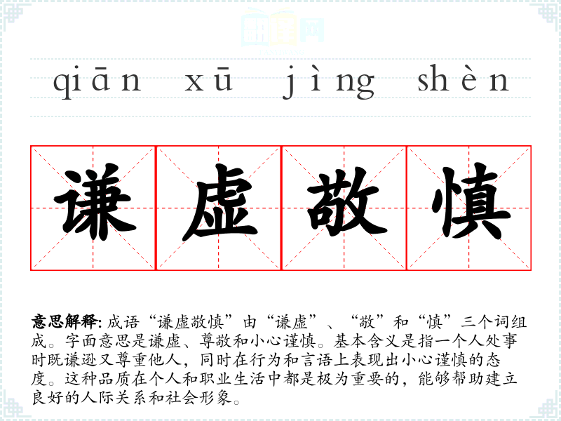 成语“谦虚敬慎”由“谦虚”、“敬”和“慎”三个词组成。字面意思是谦虚、尊敬和小心谨慎。基本含义是指一个人处事时既谦逊又尊重他人,同时在行为和言语上表现出小心谨慎的态度。这种品质在个人和职业生活中都是极为重要的,能够帮助建立良好的人际关系和社会形象。