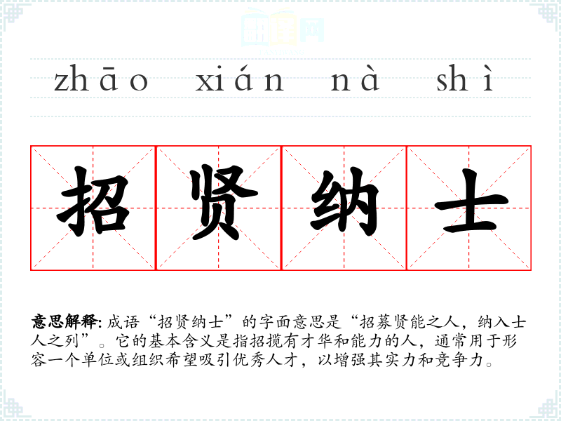 成语“招贤纳士”的字面意思是“招募贤能之人,纳入士人之列”。它的基本含义是指招揽有才华和能力的人,通常用于形容一个单位或组织希望吸引优秀人才,以增强其实力和竞争力。