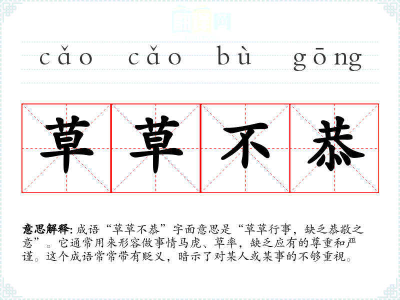成语“草草不恭”字面意思是“草草行事,缺乏恭敬之意”。它通常用来形容做事情马虎、草率,缺乏应有的尊重和严谨。这个成语常常带有贬义,暗示了对某人或某事的不够重视。
