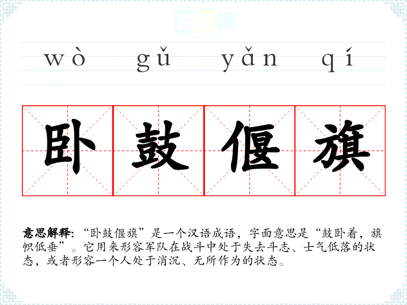 “卧鼓偃旗”是一个汉语成语,字面意思是“鼓卧着,旗帜低垂”。它用来形容军队在战斗中处于失去斗志、士气低落的状态,或者形容一个人处于消沉、无所作为的状态。