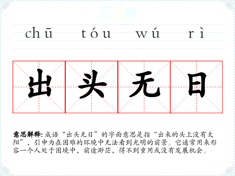 成语“出头无日”的字面意思是指“出来的头上没有太阳”,引申为在困难的环境中无法看到光明的前景。它通常用来形容一个人处于困境中,前途渺茫,得不到重用或没有发展机会。