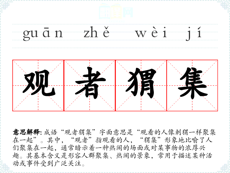 在英语中,类似的表达可以是“a crowd gathered”,同样描绘了人们聚集的景象。然而,中文成语“观者猬集”更具形象性,通过“猬”的比喻,让人更容易联想到人们的热情和好奇心。