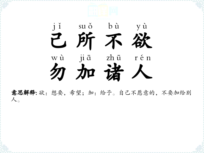 欲:希望;勿:不要;施:施加。自己不愿意的,不要加给别人。 |