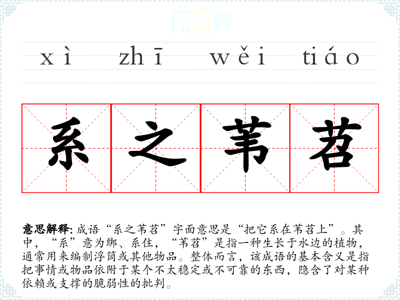 成语“系之苇苕”字面意思是“把它系在苇苕上”。其中,“系”意为绑、系住,“苇苕”是指一种生长于水边的植物,通常用来编制浮筒或其他物品。整体而言,该成语的基本含义是指把事情或物品依附于某个不太稳定或不可靠的东西,隐含了对某种依赖或支撑的脆弱性的批判。