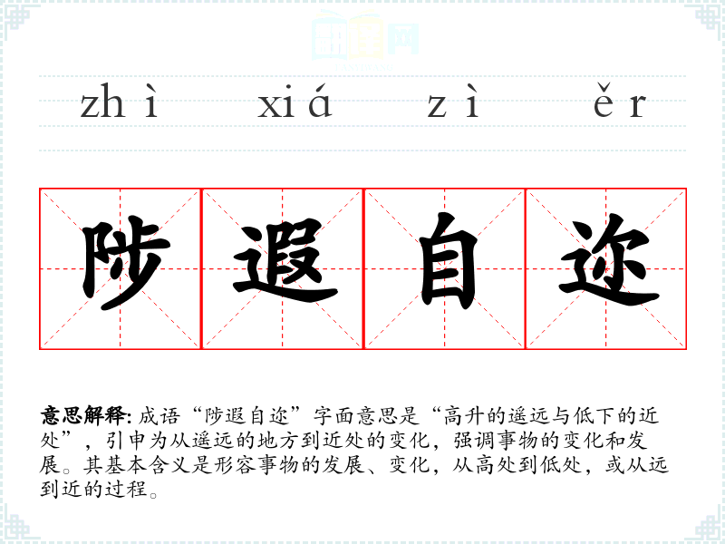 成语“陟遐自迩”字面意思是“高升的遥远与低下的近处”,引申为从遥远的地方到近处的变化,强调事物的变化和发展。其基本含义是形容事物的发展、变化,从高处到低处,或从远到近的过程。