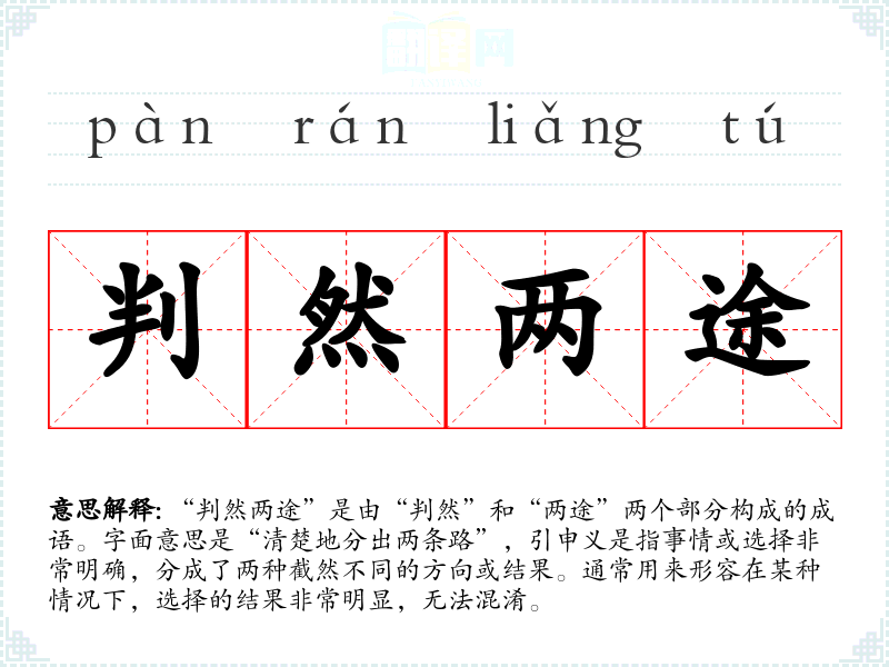 “判然两途”是由“判然”和“两途”两个部分构成的成语。字面意思是“清楚地分出两条路”,引申义是指事情或选择非常明确,分成了两种截然不同的方向或结果。通常用来形容在某种情况下,选择的结果非常明显,无法混淆。