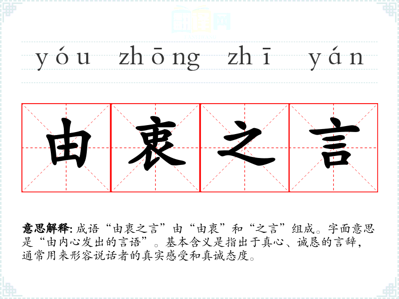 成语“由衷之言”由“由衷”和“之言”组成。字面意思是“由内心发出的言语”。基本含义是指出于真心、诚恳的言辞,通常用来形容说话者的真实感受和真诚态度。