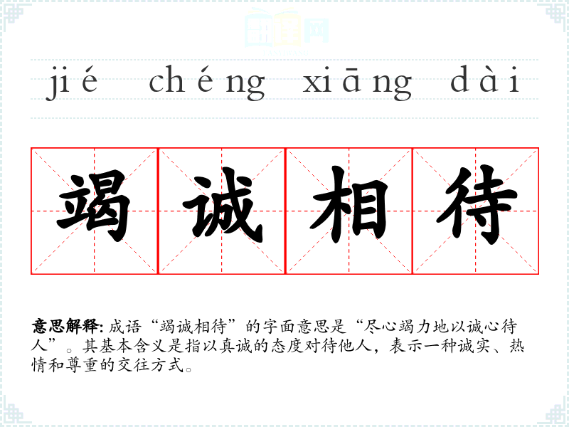 成语“竭诚相待”的字面意思是“尽心竭力地以诚心待人”。其基本含义是指以真诚的态度对待他人,表示一种诚实、热情和尊重的交往方式。