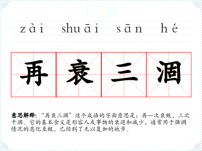 “再衰三涸”这个成语的字面意思是:再一次衰败,三次干涸。它的基本含义是形容人或事物的衰退和减少,通常用于强调情况的恶化至极,已经到了无以复加的地步。