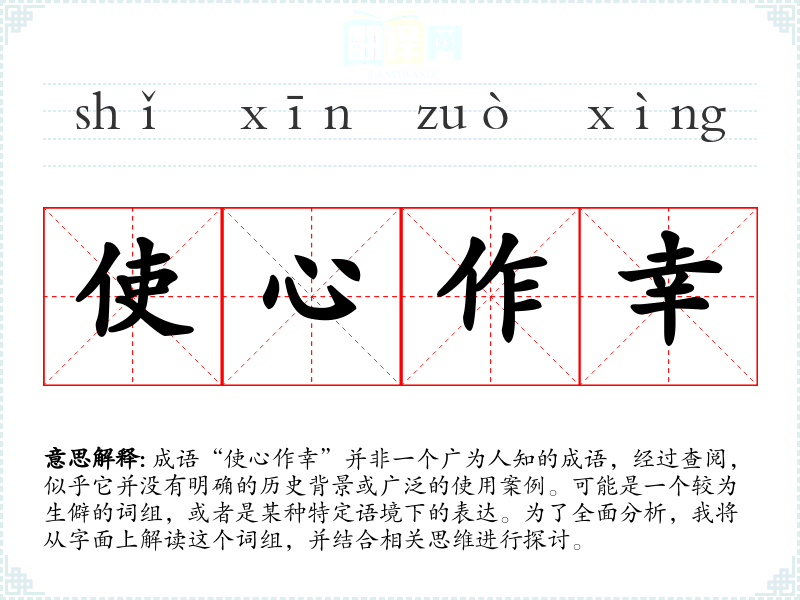 成语“使心作幸”并非一个广为人知的成语,经过查阅,似乎它并没有明确的历史背景或广泛的使用案例。可能是一个较为生僻的词组,或者是某种特定语境下的表达。为了全面分析,我将从字面上解读这个词组,并结合相关思维进行探讨。