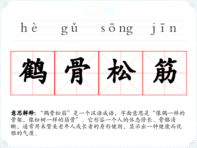 “鹤骨松筋”是一个汉语成语,字面意思是“像鹤一样的骨架,像松树一样的筋骨”。它形容一个人的体态修长、骨骼清晰,通常用来赞美老年人或**的身形健朗,显示出一种健康而优雅的气质。