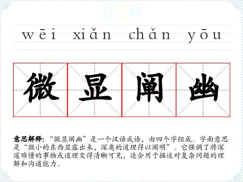 “微显阐幽”是一个汉语成语,由四个字组成。字面意思是“微小的东西显露出来,深奥的道理得以阐明”。它强调了将深邃难懂的事物或道理变得清晰可见,适合用于描述对复杂问题的理解和沟通能力。