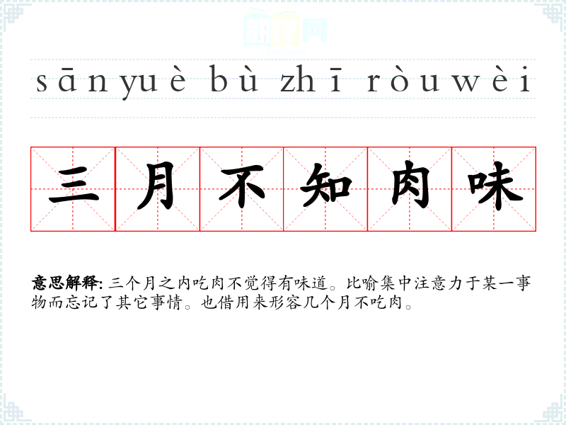 | 三月不知肉味 | 三个月之内吃肉不觉得有味道。比喻集中注意力于某一事物而忘记了其它事情。也借用来形容几个月不吃肉。 |