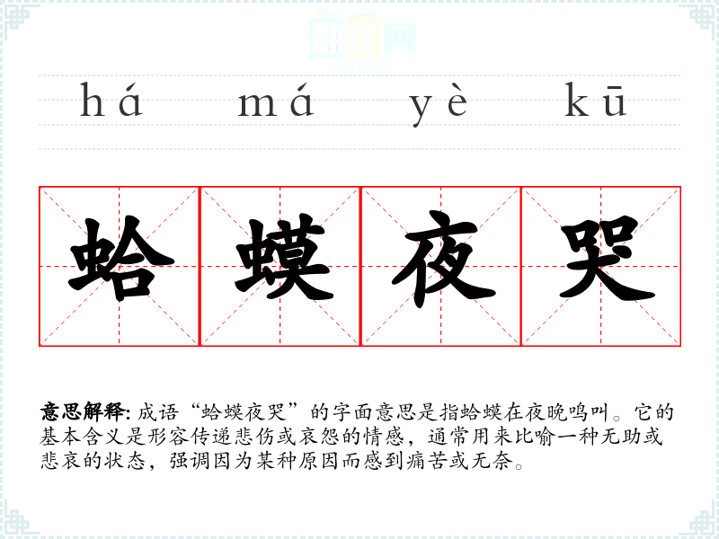 成语“蛤蟆夜哭”的字面意思是指蛤蟆在夜晚鸣叫。它的基本含义是形容传递悲伤或哀怨的情感,通常用来比喻一种无助或悲哀的状态,强调因为某种原因而感到痛苦或无奈。