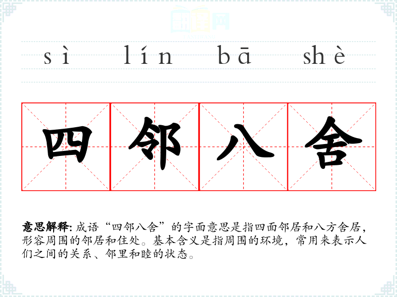 成语“四邻八舍”的字面意思是指四面邻居和八方舍居,形容周围的邻居和住处。基本含义是指周围的环境,常用来表示人们之间的关系、邻里和睦的状态。