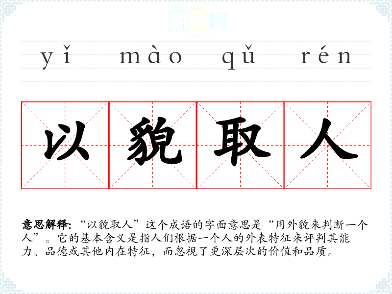 “以貌取人”这个成语的字面意思是“用外貌来判断一个人”。它的基本含义是指人们根据一个人的外表特征来评判其能力、品德或其他内在特征,而忽视了更深层次的价值和品质。