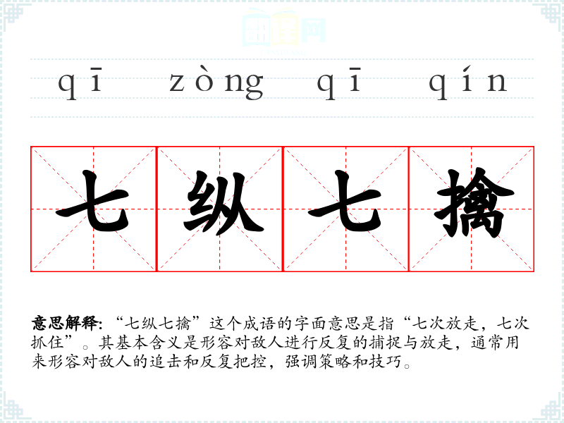 “七纵七擒”这个成语的字面意思是指“七次放走,七次抓住”。其基本含义是形容对敌人进行反复的捕捉与放走,通常用来形容对敌人的追击和反复把控,强调策略和技巧。