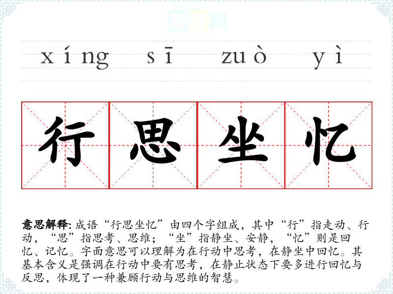 成语“行思坐忆”由四个字组成,其中“行”指走动、行动,“思”指思考、思维;“坐”指静坐、安静,“忆”则是回忆、记忆。字面意思可以理解为在行动中思考,在静坐中回忆。其基本含义是强调在行动中要有思考,在静止状态下要多进行回忆与反思,体现了一种兼顾行动与思维的智慧。
