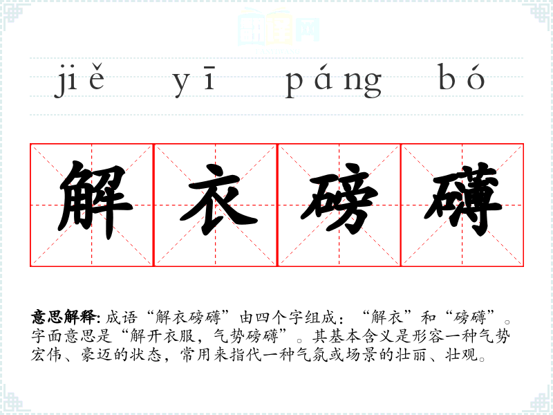 成语“解衣磅礴”由四个字组成:“解衣”和“磅礴”。字面意思是“解开衣服,气势磅礴”。其基本含义是形容一种气势宏伟、豪迈的状态,常用来指代一种气氛或场景的壮丽、壮观。