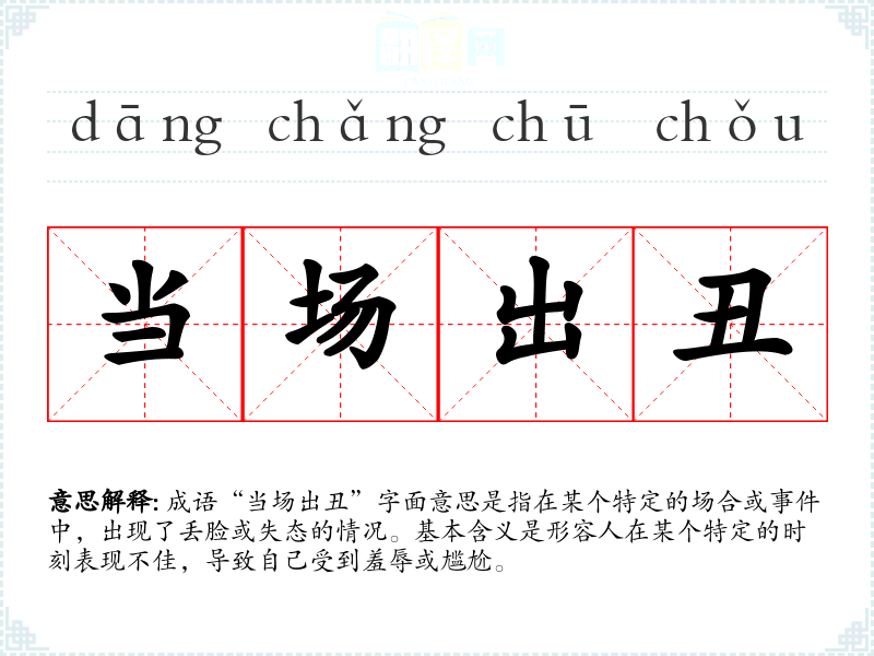 成语“当场出丑”字面意思是指在某个特定的场合或**中,出现了丢脸或失态的情况。基本含义是形容人在某个特定的时刻表现不佳,导致自己受到羞辱或尴尬。