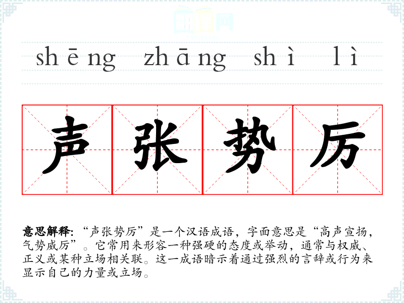 “声张势厉”的具体来源未必有明确的典故或文献依据,但可以推测其构成来自于“声张”和“势厉”两个词。声张本来是指通过声音来表达或宣扬,势厉则指气势严厉。结合在一起,强调了通过声音和气势来展示权威或立场的概念。