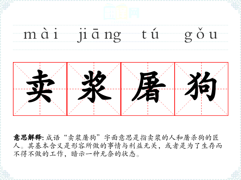 成语“卖浆屠狗”字面意思是指卖浆的人和屠杀狗的匠人。其基本含义是形容所做的事情与利益无关,或者是为了生存而不得不做的工作,暗示一种无奈的状态。