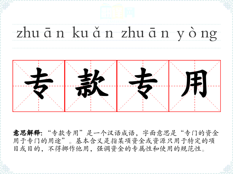 | 专款专用 | 专门用于指定项目的钱款专项使用。 |