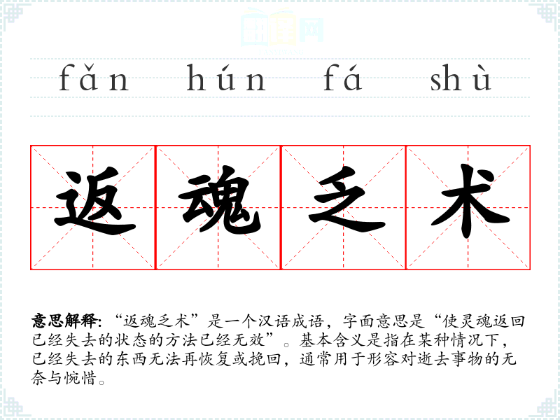 “返魂乏术”是一个汉语成语,字面意思是“使灵魂返回已经失去的状态的方法已经无效”。基本含义是指在某种情况下,已经失去的东西无法再恢复或挽回,通常用于形容对逝去事物的无奈与惋惜。
