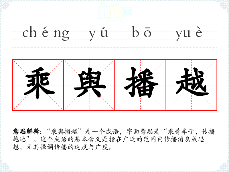 该成语的出处可以追溯到**古代文献,尤其是与历史、文学相关的作品。虽然没有确切的文献记载,但其构成的词语“乘舆”与“播越”均在古代文人中有广泛使用,通常与旅行、传播、交流等主题相关。特别是在描述君王出行时,常常提到“乘舆”,而“播越”则表示传播消息,二者结合形成了这个成语。