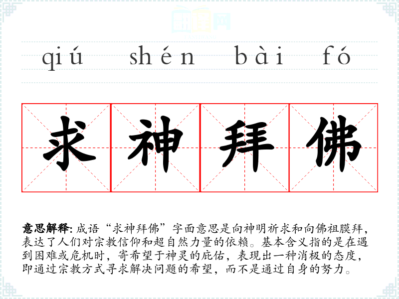 | 求神拜佛 | 礼拜神仙,请求保佑。 |