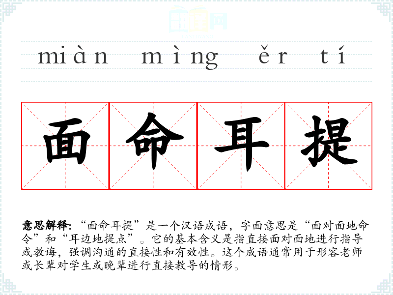 “面命耳提”源自于古代的教导方式,尤其在儒家文化中,重视师生之间的面对面交流。具体的历史背景和典故可能并不详细,但反映了古代教育中,师者与学生之间的亲密互动和教学方式。