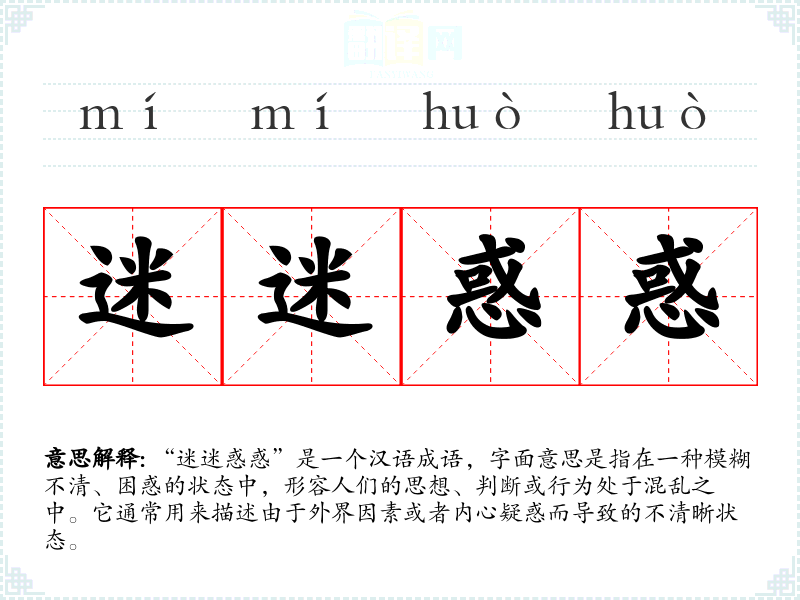 “迷迷惑惑”是一个汉语成语,字面意思是指在一种模糊不清、困惑的状态中,形容人们的思想、判断或行为处于混乱之中。它通常用来描述由于外界因素或者内心疑惑而导致的不清晰状态。